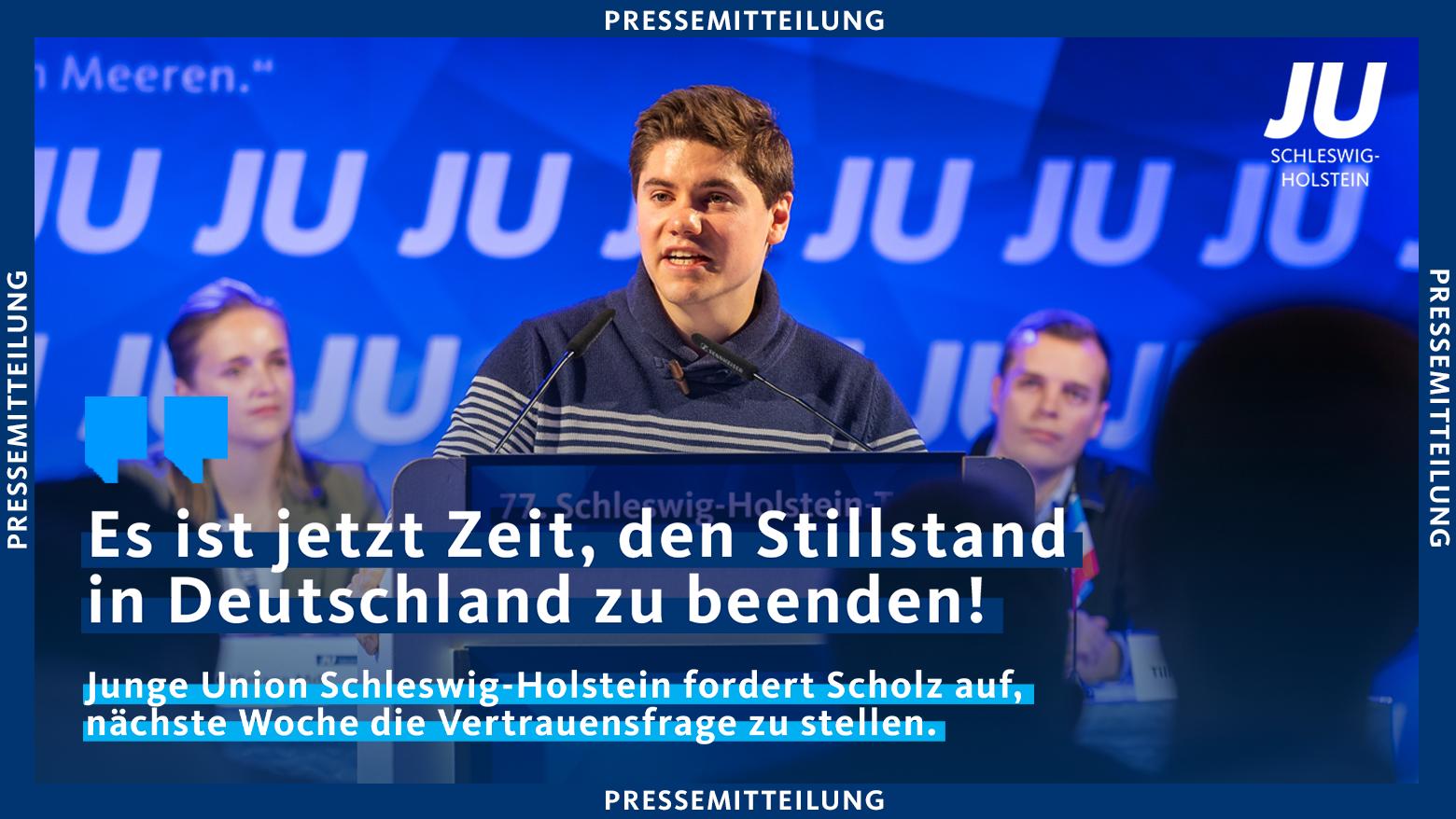 Die Junge Union Schleswig-Holstein begrüßt die Ankündigung von Bundeskanzler Olaf Scholz und damit den Weg für Neuwahlen frei zu machen. Gleichzeitig wird das Aufschieben der Vertrauensfrage bis zum Januar 2025 kritisiert. Insbesondere vor dem Hintergrund der vielzähligen innen- und außenpolitischen Herausforderungen, vor denen wir stehen, brauchen wir für unser Land und für Europa so schnell wie möglich eine verlässliche Bundesregierung.